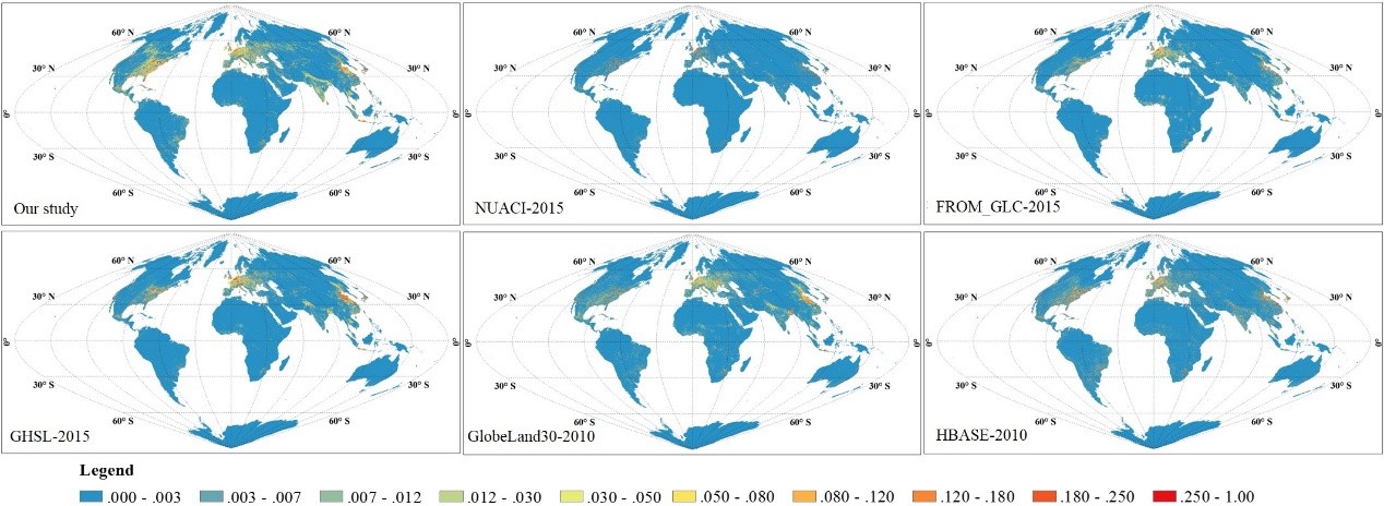 图2 研究生产的全球不透水面产品与同类30米产品的空间分布格局对比